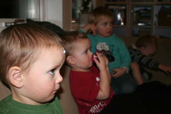 Både Rasmus och Linus på besök, en film samlade alla boysen i soffan. Simon hade gjort sig extra snygg med en äppelklisterlapp i pannan. "Jag gillar klistermärken!"